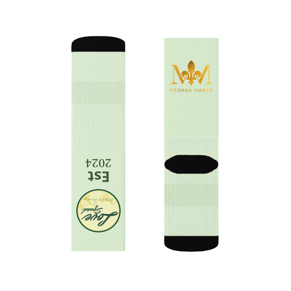 Love Squad logo, est 2024 in signature R+R green and gold with Meghan March logo on the back. These crew socks feature a soft ribbed leg, plush cushioned bottom, and breathable stretchy materials for all-day wear.